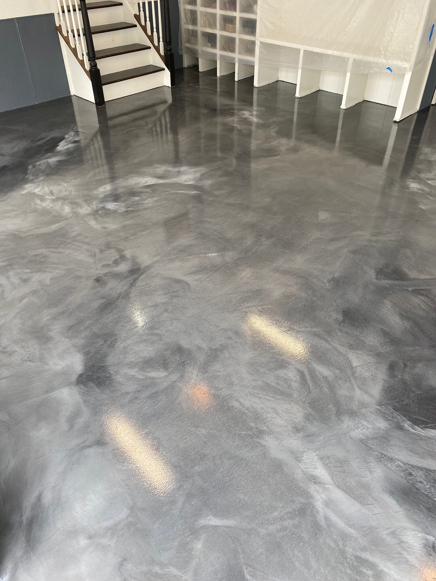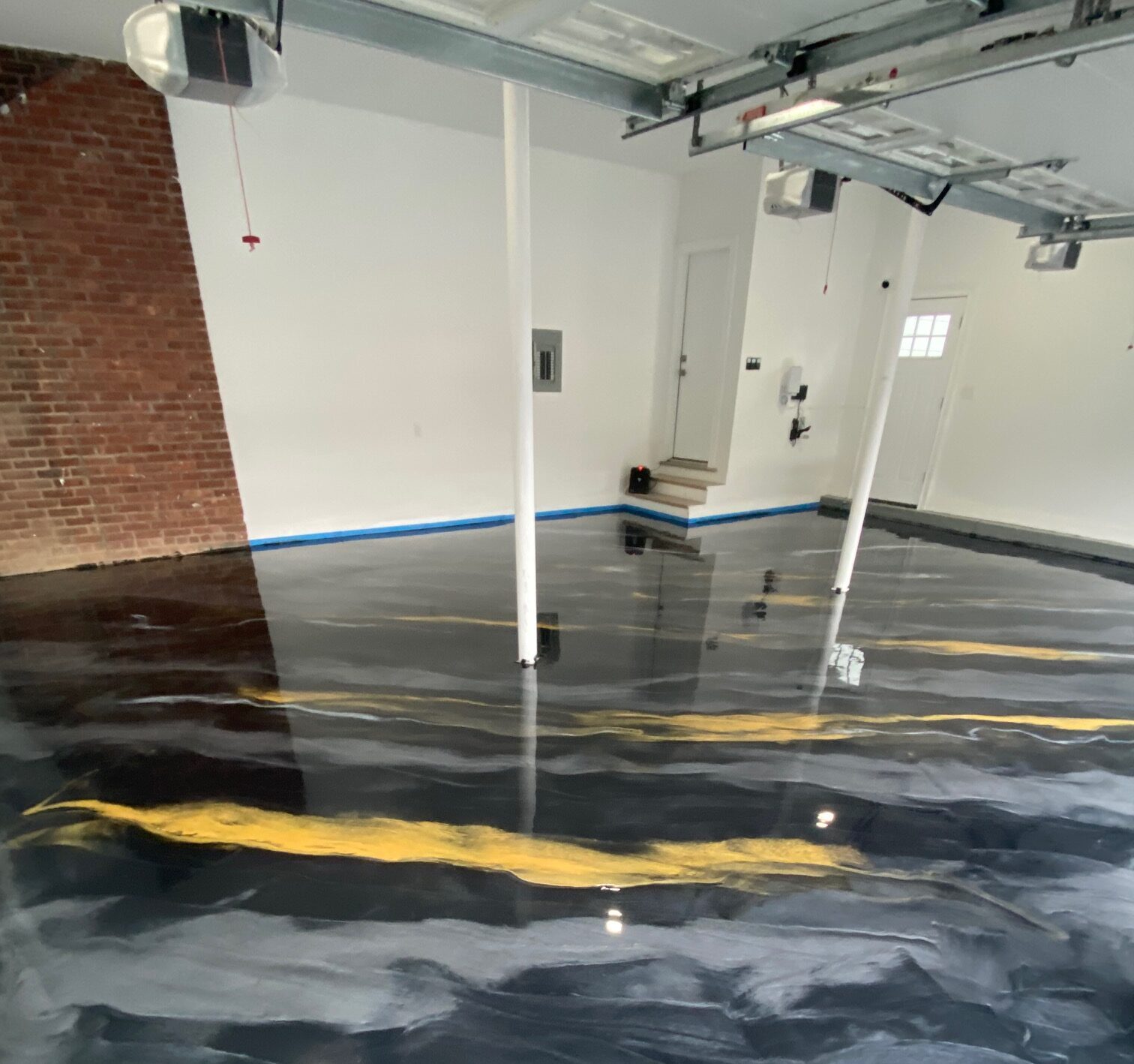 We prep your concrete with commercial grinders, patch imperfections, apply 100% solids epoxy, then broadcast flakes or smooth out solid finishes. We finish with a high-durability topcoat for added protection and gloss.